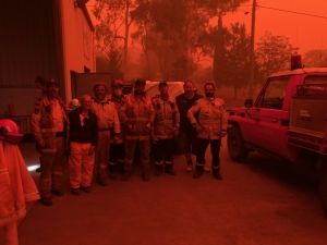 Bega Corps Officer Captain Rod Parsons delivered meals to the Quarma RFS, including this crew under an eerie orange sky in the Bega Valley area.